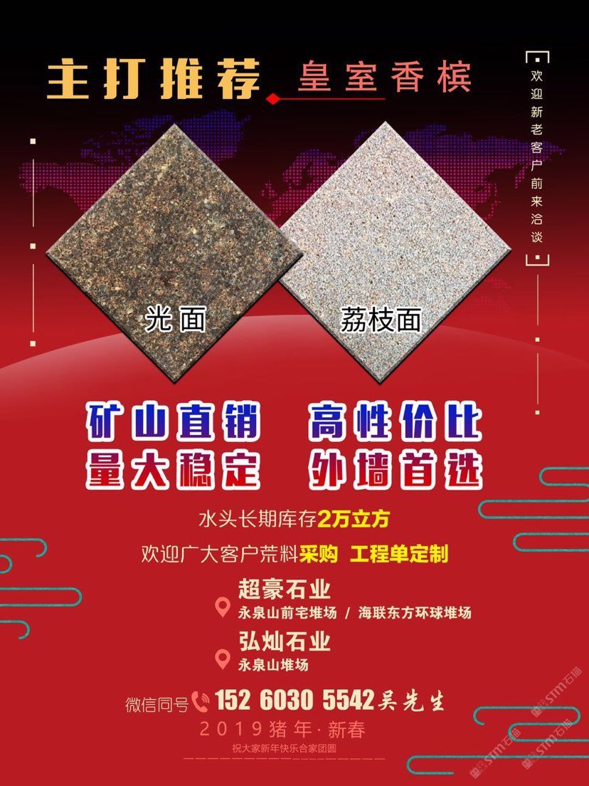 本公司自有工廠,專(zhuān)業(yè)承接各種國(guó)內(nèi)外工程,別墅,酒店,大理石花崗巖異性線(xiàn)條訂單! ????強(qiáng)力推薦,礦山直銷(xiāo)《皇室香檳》量大穩(wěn)定,石料方正、底色均勻、石材缺陷少。工程????長(zhǎng)期庫(kù)存荒料2萬(wàn)方,各類(lèi)樣品已備好????歡迎來(lái)電咨詢(xún) 為有建筑幕墻(酒店、公寓、商務(wù)大廈、寫(xiě)字樓,別墅等)工程項(xiàng)目的朋友,提供優(yōu)質(zhì)的石材資源。 誠(chéng)信經(jīng)營(yíng)、合作共贏、服務(wù)至上、期待與您共同發(fā)展! 財(cái)富熱線(xiàn):15260305542 吳 ?? ?? ??