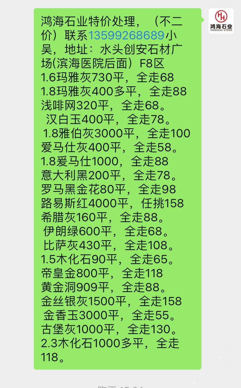 鴻海石業(yè)-現(xiàn)板5萬平特價處理,(不二價)聯(lián)系13599268689小吳,地址:水頭創(chuàng)安石材廣場(濱海醫(yī)院后面)F8區(qū) 1.8絲綢白3000平,150起 1.8金絲銀灰7500平,100起1.8夢幻藍4500平,100起。1.8卡拉垃白一150元起。 1.8藍色星球1300平,150起水墨年華6000平全走78。 1.8午夜星河1300平,150起1.8多蘭戈(紅色)300平,柏斯高灰2000平,全走88 新瑪雅灰3500平,全走88 1.5瑪雅灰200多平,全走68 星塵灰400平,全走88。 愛馬仕灰7500平,全走78 羅馬黑金花60平,全走88 黃金洞909平,全走88。 金香玉300平,全走50。 古堡灰1000平,全走99。 云?;?00多平全走128。2.3木化石100平,全走128。