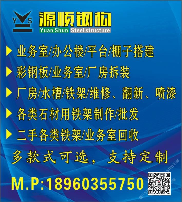 專業(yè):電焊、保護(hù)焊、等離子切割機(jī),氣割等~ 承接:業(yè)務(wù)室搭建、拆移、彩鋼板拆、裝、 二手鐵架,二手火車架,二手A字架 各類石材用鐵架:大板車,成品架,A字架,火車架,插桿A字架,鐵桶。 石材工具:集裝箱裝(卸),石材吊具,液壓車,布條,鋼絲繩。 電話:18960355750