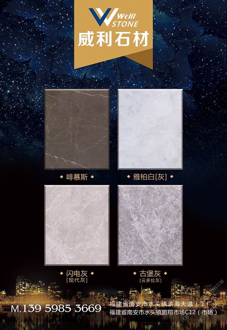 南安市威利石材有限公司成立于2008年,是一家集礦山開采、加工、銷售、工程設(shè)計施工、進出口貿(mào)易為一體的綜合型企業(yè)。我們不僅提供石材,更為您精心設(shè)計全套優(yōu)質(zhì)的石材解決方案。 威利石材專注于石材產(chǎn)品的礦山荒料直銷、大板加工、大板展銷、工程設(shè)計、工程配套施工服務(wù) 。公司主營啡慕斯、黑白根、塞浦路斯灰、古堡灰,愛馬仕灰(溫德姆灰),雅柏白,閃電灰多種優(yōu) 質(zhì)品種。公司已成為一家集專業(yè)化、產(chǎn)業(yè)化和規(guī)?;墓こ滩牧喜少?、加工配套服務(wù)商。 威利石材以自己多年專業(yè)化和國際化的經(jīng)營,與國內(nèi)外礦山建立了良好的商業(yè)信譽和經(jīng)貿(mào)合作關(guān) 系,贏得了國外礦山在中國區(qū)營銷戰(zhàn)略的全力支持。 威利石材依靠豐富的礦山資源,先進的管理、施工經(jīng)驗,堅持“以市場為導(dǎo)向、以技術(shù)為主體、 以質(zhì)量為命脈、以效益為中心”,大膽探索,在技術(shù)進步、生產(chǎn)經(jīng)營、企業(yè)管理、產(chǎn)品質(zhì)量、售后服務(wù)等 方面始終走在行業(yè)的前列。并在信守“質(zhì)量為準(zhǔn)、信譽優(yōu)等、服務(wù)為上”的企業(yè)精神指導(dǎo)下,產(chǎn)品暢銷世 界各地,深得消費者的信賴和贊譽。我們時刻把握時代脈搏,走在市場前沿,揮灑石材文化,增添人類輝煌。多年來我們一直致力于服務(wù)質(zhì)量的提高?!邦櫩蜑樯稀?、“追求圓滿”已經(jīng)融入到公司的企業(yè)文化、經(jīng)營 理念當(dāng)中,并且在產(chǎn)品生產(chǎn)、過程服務(wù)、售后追蹤等具體工作中得到落實。 我們的追求——集世界美石,為中國添彩!\