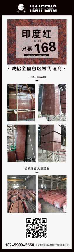 海豐石業(yè) 聯(lián)系人:吳澤賢(印度紅)    185****0999 查看 185****0999 查看 主營范圍: 荒料、花崗巖加工、礦山、石材外貿(mào)、薄板復(fù)合板加工、 企業(yè)地址:福建泉州南安市濱海大道建材市場旁