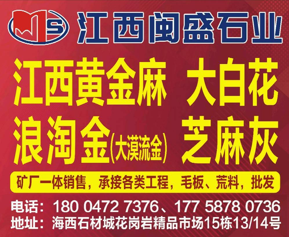 江西閩盛石業(yè) 聯(lián)系人:呂    177****0736 查看 177****0736 查看 主營范圍: 荒料、花崗巖加工、礦山、 企業(yè)地址:福建泉州海西石材城花崗巖區(qū)15棟14/13號