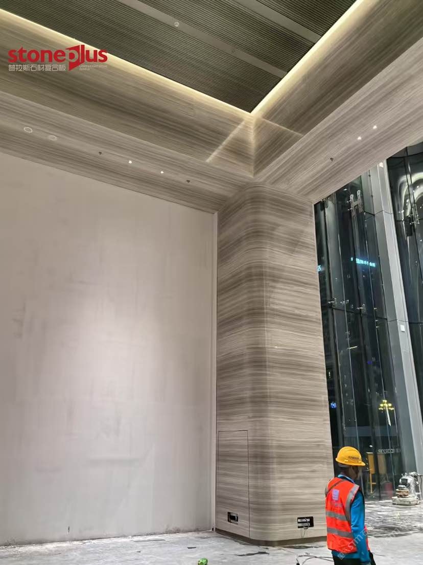發(fā)布信息: 澳門中心位于廣州市黃埔區(qū)魚珠片區(qū),項目定位為商業(yè)商務綜合體打造以港澳特色為主的、有國際影響力的科技金融和數(shù)字經濟總部基地,并大力引入澳門文化和商業(yè)業(yè)態(tài),打造充滿澳門風情的文創(chuàng)藝術街區(qū),實現(xiàn)科技金融產業(yè)一體化、粵澳葡三地合作一體化。 其中大樓室內墻面采用白木紋復合鋁蜂窩,預埋螺栓打孔后再進行復合,到現(xiàn)場進行干掛安裝;包柱采用白木紋復合鋁蜂窩平板拼弧工藝,對手加工工藝要求較高,我們普拉斯加工對品質的追求與現(xiàn)場的安裝效果相得益彰。