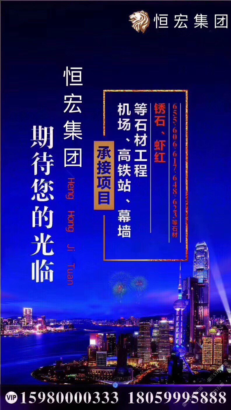 發(fā)布信息: 【恒宏建材有限公司】主營(yíng):銹石、蝦紅、珍珠白、602#、603#、623#、654#、655#、617#、648#、白麻、灰麻、銀河灰、虎皮黃、虎皮紅、虎皮白、英國(guó)棕、皇室香檳、閃電米黃、白玉蘭、奧特曼、云多拉灰、塞浦路斯灰等國(guó)內(nèi)外花崗巖、大理石,護(hù)欄欄桿、異形?? 電話: 15980000333張(花崗巖) 18059995888洪(大理石)