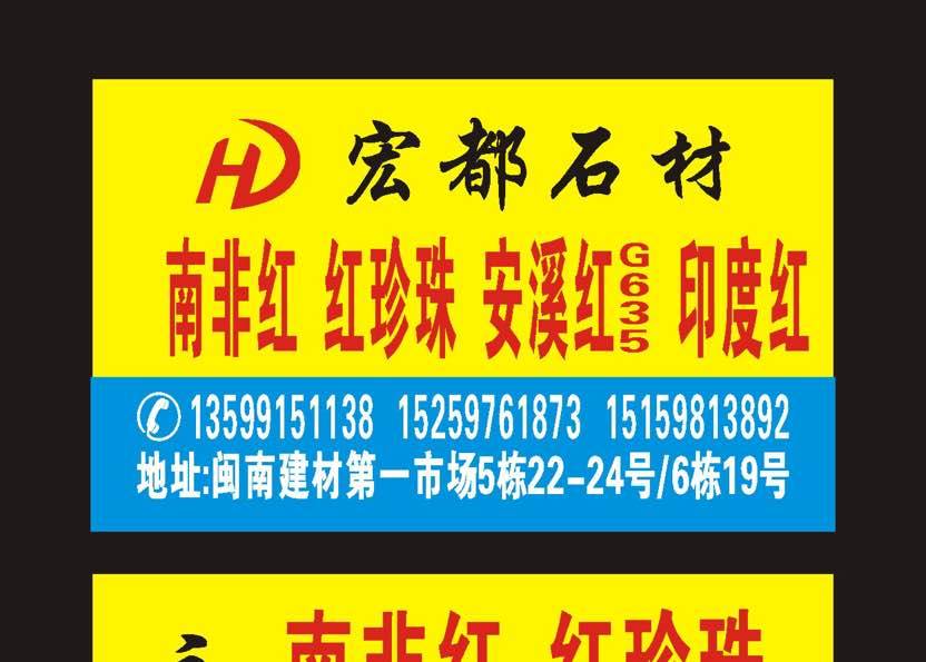 南安市宏都石材 聯(lián)系人:吳佳慧    151****3892 查看 059****73892 查看 主營范圍: 花崗巖加工、荒料、異型加工、石材交易市場、物流、 企業(yè)地址:福建泉州南安市G324(福昆線)中國·水頭中國石材城