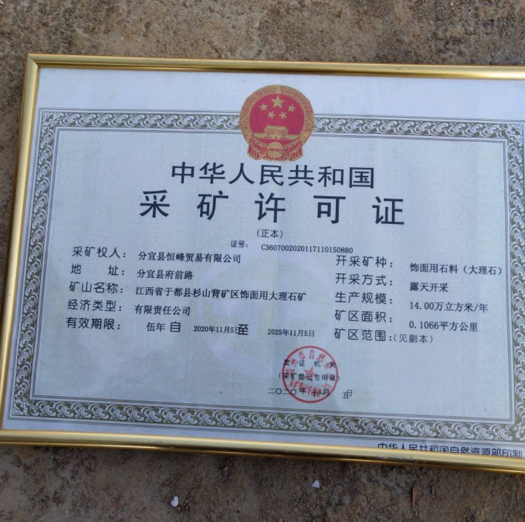 江西展盛石業(yè) 聯(lián)系人:李軍    135****0768 查看 手機號碼:無 主營范圍: 荒料、礦山、 企業(yè)地址:江西贛州贛州市于都縣銀坑鎮(zhèn)梅屋村