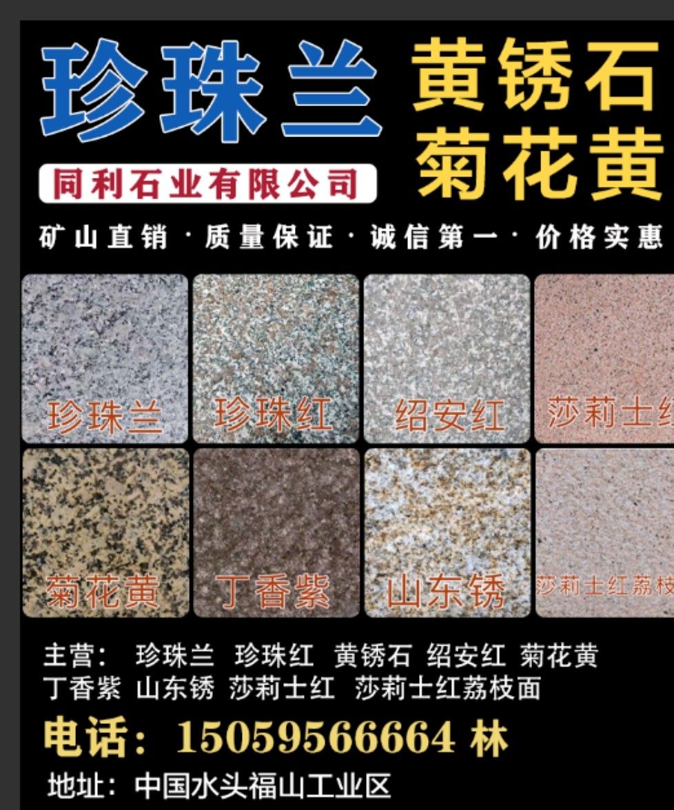 企業(yè)地址:福建南安門市地址:福建省南安市水頭鎮(zhèn)閩南建材第一市場33幢6號(同利石業(yè))。工廠地址:山東省濟寧市汶上縣白石鎮(zhèn)白石工業(yè)區(qū)。