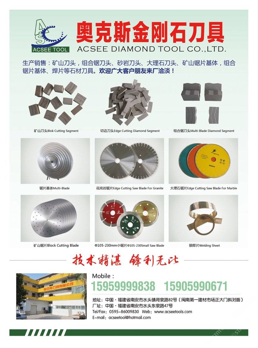 奧克斯金剛石刀具 聯(lián)系人:郭先生    159****9838 查看 手機號碼:無 主營范圍: 石材輔料及特殊工藝、 企業(yè)地址:福建泉州福建省南安市水頭鎮(zhèn)荷泉路82號