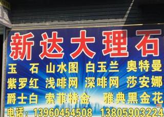 新達(dá)大理石主營(yíng)產(chǎn)品:奧特曼(旺程礦),紅龍玉4,紅龍玉3,黑龍玉,山水畫6,白雪公主,白玉3,土耳其玫瑰,紅寶石,索菲特金,白玉蘭企業(yè)地址:福建南安水頭閩南建材市場(chǎng)加工區(qū)A幢32-33號(hào)。