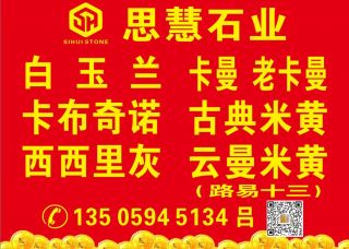 思慧石業(yè)主營(yíng)產(chǎn)品:白玉蘭,白玉蘭3,白玉蘭(8號(hào)礦),白玉蘭(艾斯特),白玉蘭(白珍珠),白玉蘭ECE,白玉蘭(EG礦),白玉蘭(飛馬礦),白玉蘭2,白玉蘭1,白玉蘭4,西西里灰,西西里灰1,西西里灰2,古典米黃,古典米黃1,卡布奇諾,云曼米黃,云曼,卡曼,卡曼米黃,金卡曼,路易十三,路易十三1(CGM),勞力士灰,奧特曼,歐曼米黃,奧特曼(巴拉礦),奧特曼(捷成礦),奧特曼(卡麻桑礦),奧特曼(老蕭礦),奧特曼(卡瑪薩礦),奧特曼米黃,奧特曼金,白玉蘭(胖子礦),白玫瑰企業(yè)地址:福建泉州東升石材城4號(hào)門通道走到底左手邊D26